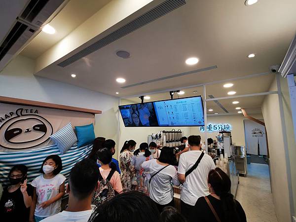【再睡5分鐘】店面採用比較簡約的設計,點餐檯上有兩個熒幕,左邊的播放著宣傳影片,而右邊則放菜單和叫號的介面,讓客人清楚看到目前叫到的是幾號。